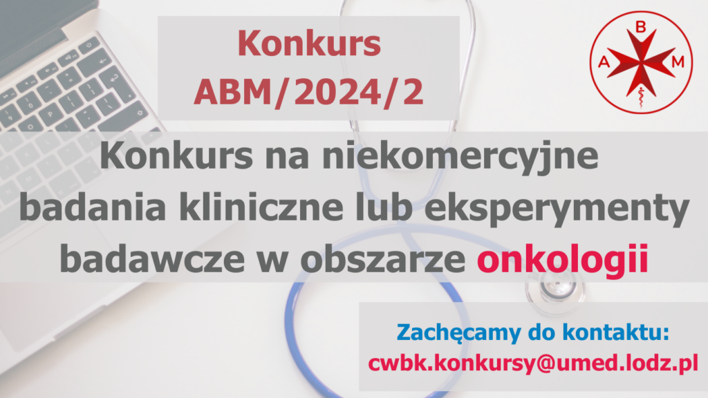 W czerwcu Agencja Badań Medycznych opublikuje regulamin konkursu na niekomercyjne badania kliniczne i eksperymenty badawcze z zakresu onkologii. Cele konkursu: Zespoły badawcze z koncepcją/pomysłem na projekt prosimy o wypełnienie krótkiego formularza dot. ogólnych założeń projektu (Formularz) i przesłanie do Centrum Wsparcia Badań Klinicznych (cwbk.konkursy@umed.lodz.pl).